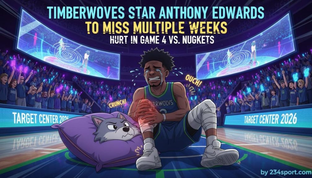 Timberwolves star Anthony Edwards is expected to miss multiple weeks due to a knee injury sustained in Game 4 against the Nuggets, significantly impacting Minnesota's season outlook.